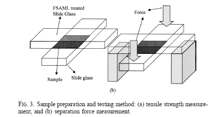 固定其中一個玻璃片的兩端,在另一個玻璃片上用力,將兩玻璃片分開,測試這個分離力的大小。